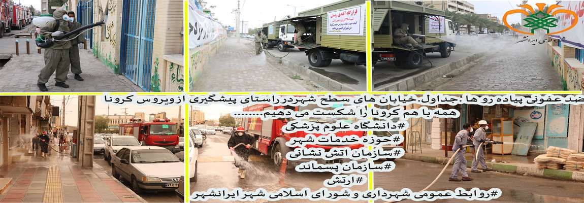 ضد عفونی خیابان ها.جداول.پیاده رو ها با همکاری دانشگاه علوم پزشکی.ارتش.روابط عمومی شهرداری و شورای اسلامی شهر ایرانشهر