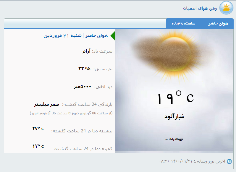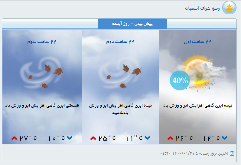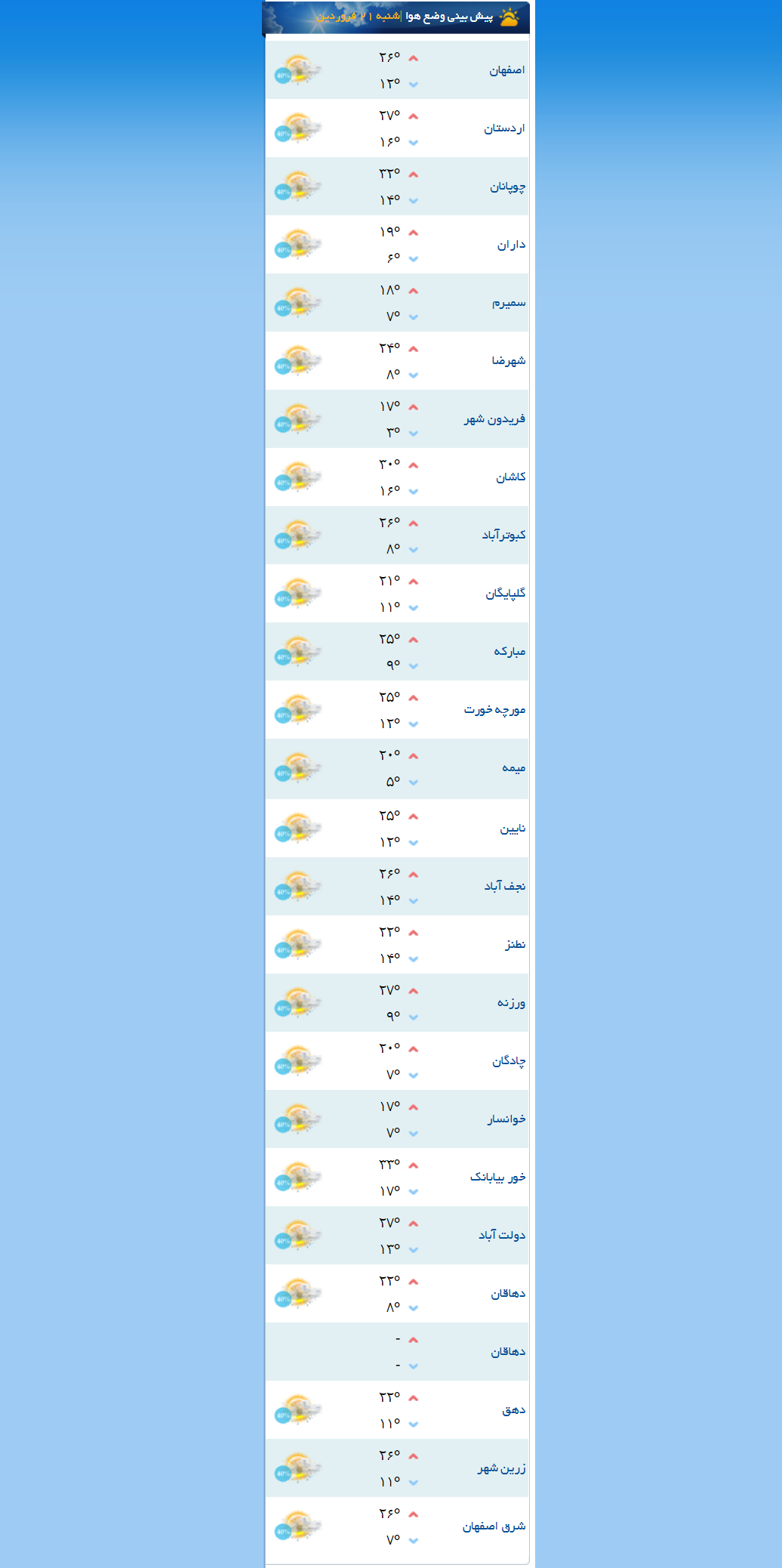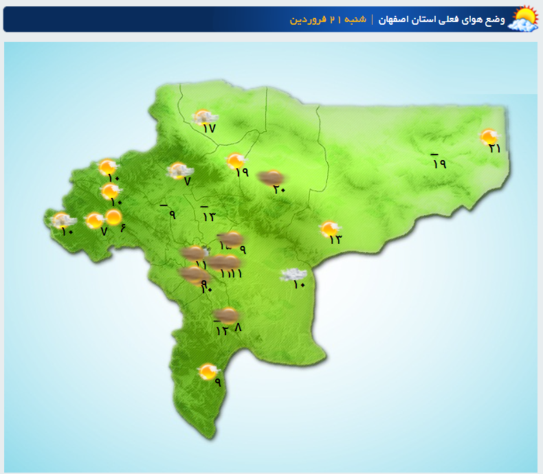 بر اساس این گزارش دمای هوا در 24 ساعت آینده در اکثر مناطق استان یک تا پنج درجه کاهش خواهد داشت و هوای کلانشهر اصفهان امروز و فردا نیمه ابری گاهی افزایش ابر و وزش باد به نسبت شدید و رگبار پراکنده بهاری و احتمال رعدوبرق پیش بینی میشود.