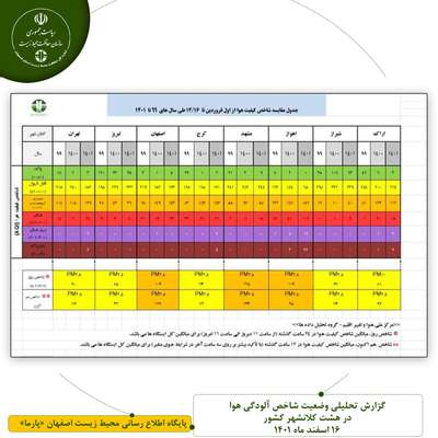 به گزارش پایگاه اطلاع رسانی سازمان حفاظت محیط زیست، طبق گزارش دریافتی از مرکز ملی هوا و تغییر اقلیم سازمان حفاظت محیط زیست، وضعیت شاخص آلودگی هوا در 8 کلانشهر در تاریخ 16اسفند ماه 1401 به شرح زیر است :