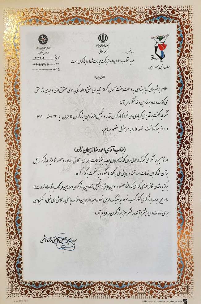 تقدیر بنیاد شهید و امور ایثارگران کشور از دکتر احمدرضا لاهیجان زاده